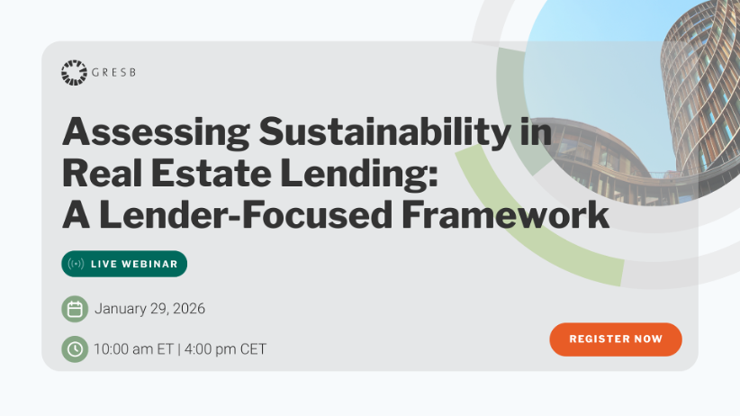 Join us online on January 29 for a webinar providing an overview of the GRESB Real Estate Lender Assessment, covering why it was developed, how it works in practice, and how it supports benchmarking, oversight, and credible engagement for lending and credit teams.