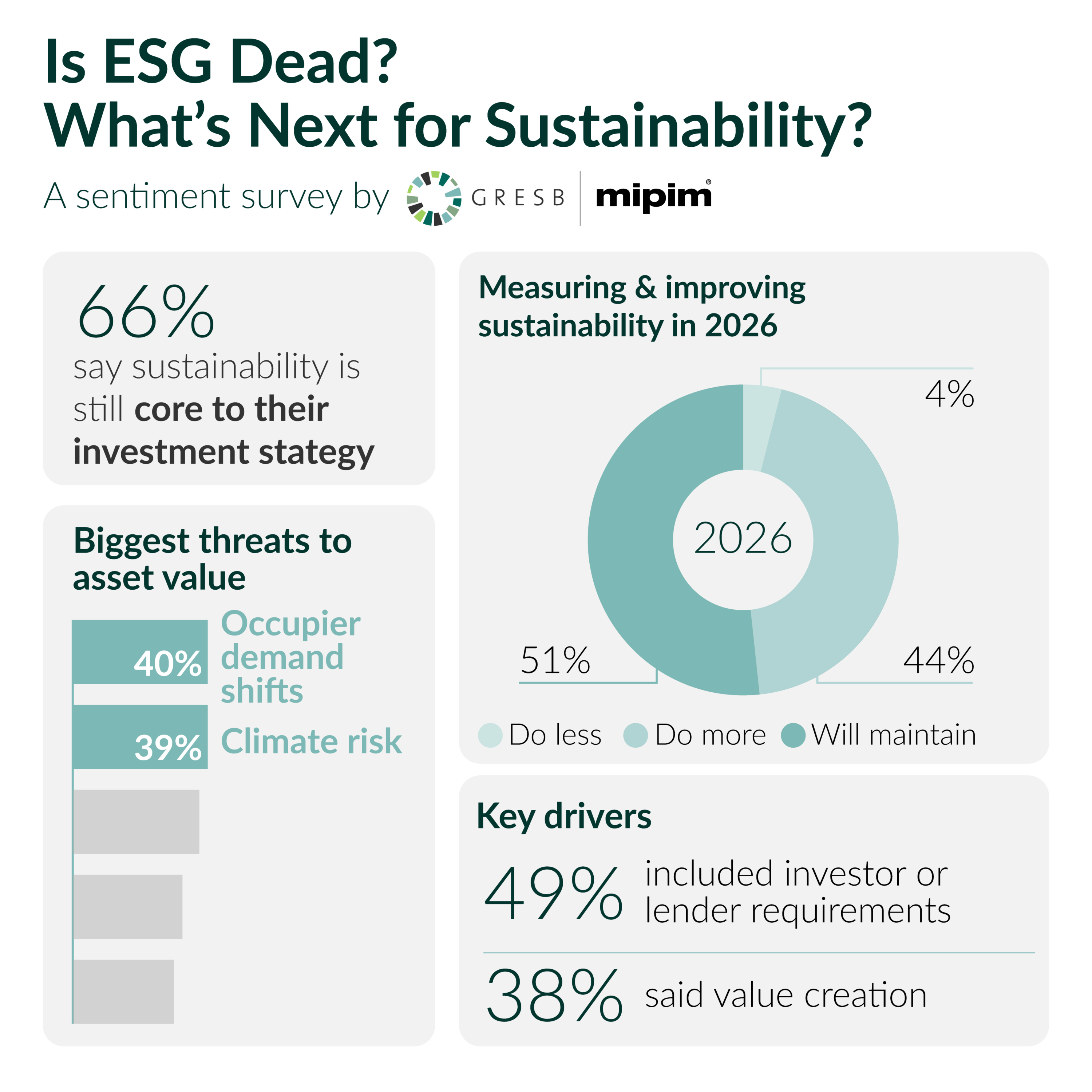 January 16, 2026. A new survey by GRESB, the global sustainability benchmark for real assets, and MIPIM, the world’s leading portfolio of property events, shows that sustainability remains a core priority for investors and managers despite recent language shifts around ESG.