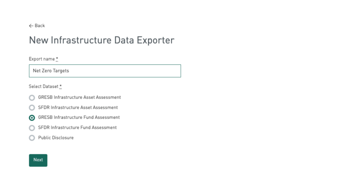 After clicking on ‘Create a new data export’ and choosing ‘GRESB Infrastructure Fund Assessment’, you can select the desired variables with our search function.