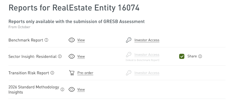 The insights contained in the report are designed for participants. The report is not available to Investor Members and cannot be shared with them in the Portal. Please contact GRESB for any questions on distribution.