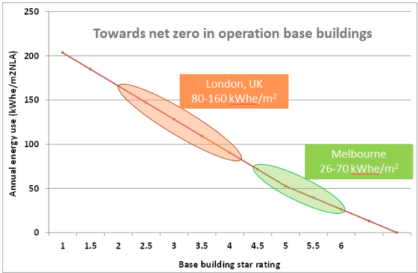 The prospect of targeting ‘nearly zero’ for buildings handed over from the start of 2021, as mandated by the EPBD, means we must consider how close to zero is ‘nearly’. Stakeholders might expect NZE buildings to be approaching zero energy use on a scale that covers the full range of performance for the applicable building type. Australia offers a template, fully-proven for commercial office buildings. The NABERS scale for rating office ‘base building’ operational energy performance has eleven points from one to six stars, with half stars between the whole stars. The scale was calibrated in 1999, when 15% of buildings performed poorer than 1 star, average base building performance was 2.5 stars and 4 stars was best practice. Today, the stock average rating is 4.2 stars, while nearly all new offices achieve at least 4.5 stars, most reach 5 stars or better, and a few are beginning to achieve 5.5 or 6 stars. The NABERS 6 stars level is defined as half-way from 5 stars to net zero and is a credible contender for a ‘nearly zero’ target that genuinely lives up to the name. In energy terms, in Melbourne, it translates to 26 kWh/m2 of NLA per year for all base building services, in an all-electric building.