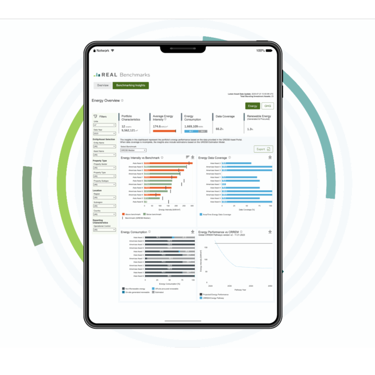 - Benchmarks against CRREM and key thresholds from ASHRAE and GRESB