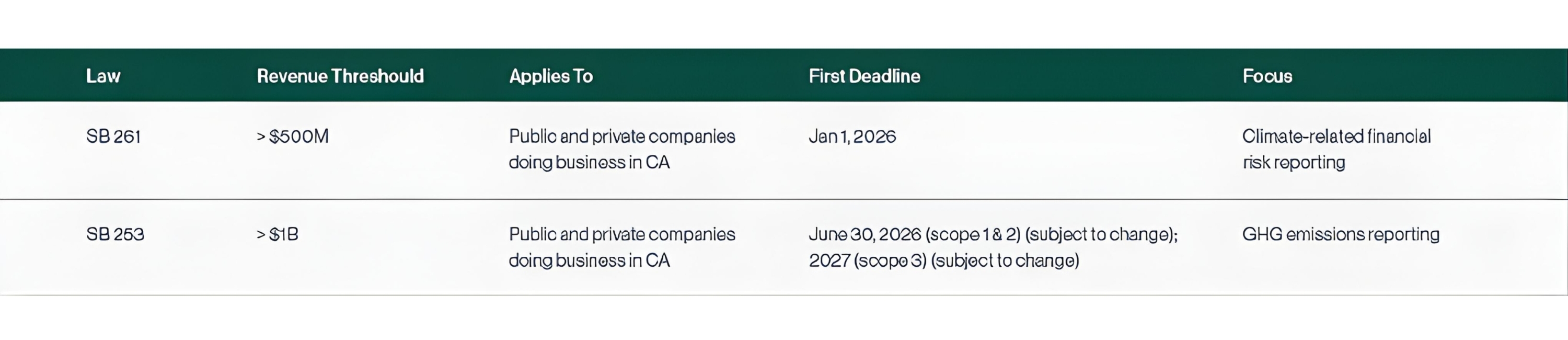 Together, California’s SB 261 and SB 253 establish the most comprehensive state-level climate reporting requirements in the nation. Adopted in 2023, SB 261 requires disclosure of climate-related financial risks, while SB 253 mandates GHG emissions reporting.